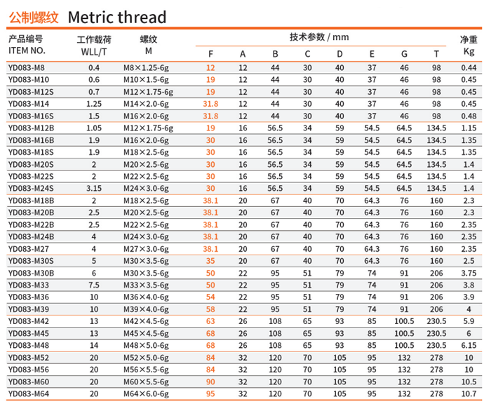 冠航公制螺纹YD083-M30S旋转吊环的设计使得吊装操作更加稳定和安全,同时也适用于索具连接,使连接点在各个方向上都具有灵活性,适应不同工况。在需要旋转的设备或机械结构中,冠航万向旋转吊环可以作为连接点,提高操作效率。